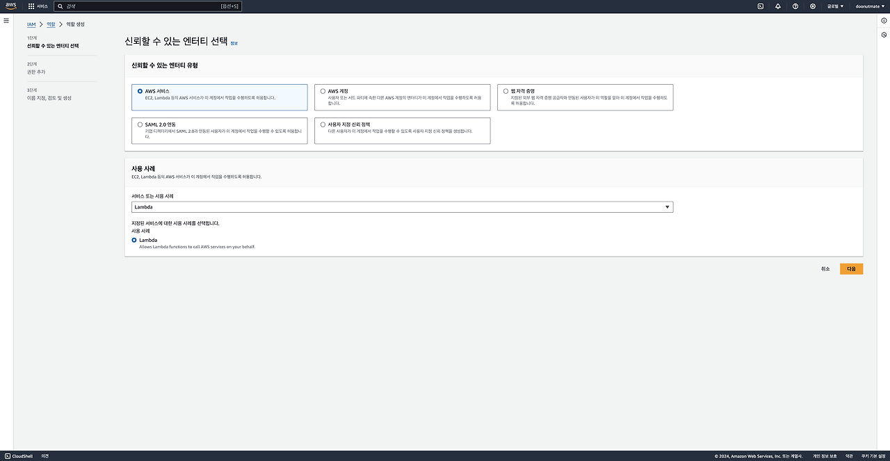 5) 신뢰할 수 있는 엔터티 유형에는 AWS 서비스를, 사용 사례에는 Lambda를 설정합니다.