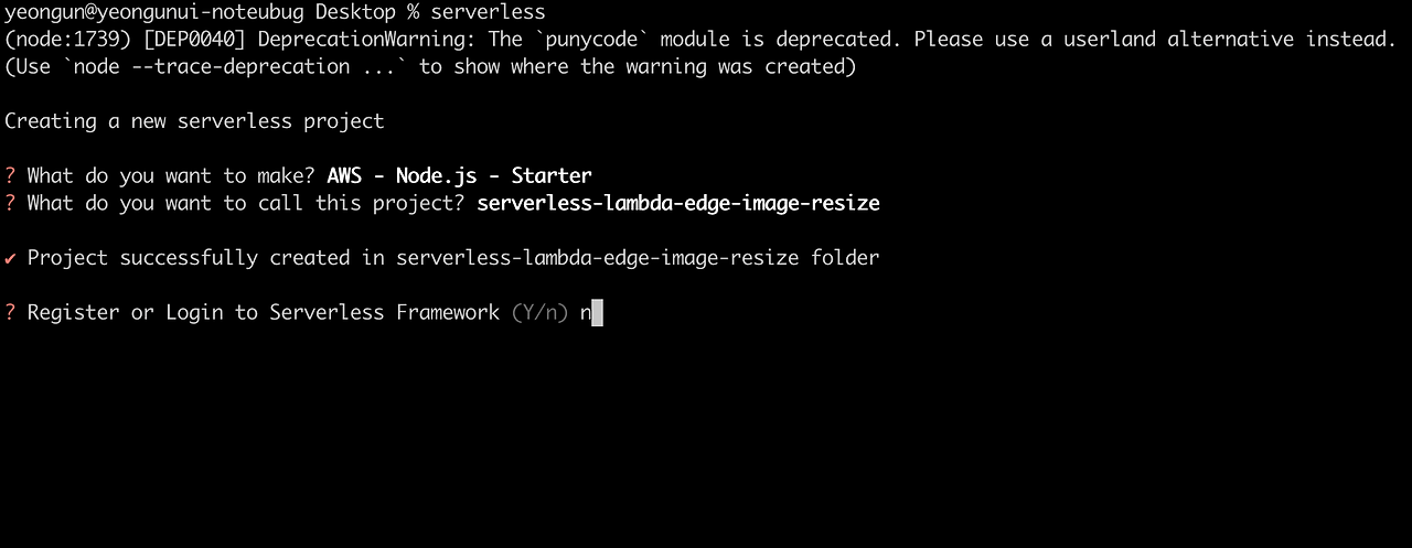 그 다음 serverless framework에 로그인할 것인지 묻는데, n을 입력합니다.