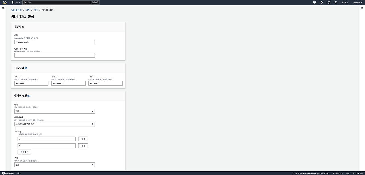3) 캐싱 정책에 이름을 넣고, 쿼리 문자열에 w, h를 추가합니다. 캐싱된 이미지는 기본적으로 변경될 일이 없기에 최소 TTL, 최대 TTL, 기본 TTL 모두 최대인 31536000로 설정했습니다.