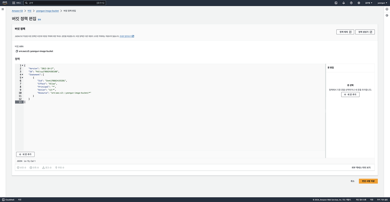 "Resource": "arn:aws:s3:::yeongun-image-bucket/*" // 본인의 S3 arn으로 수정