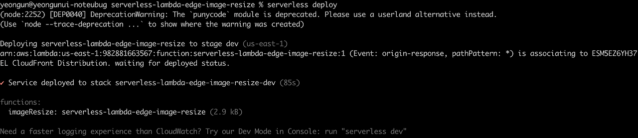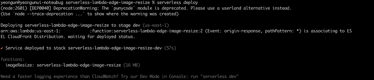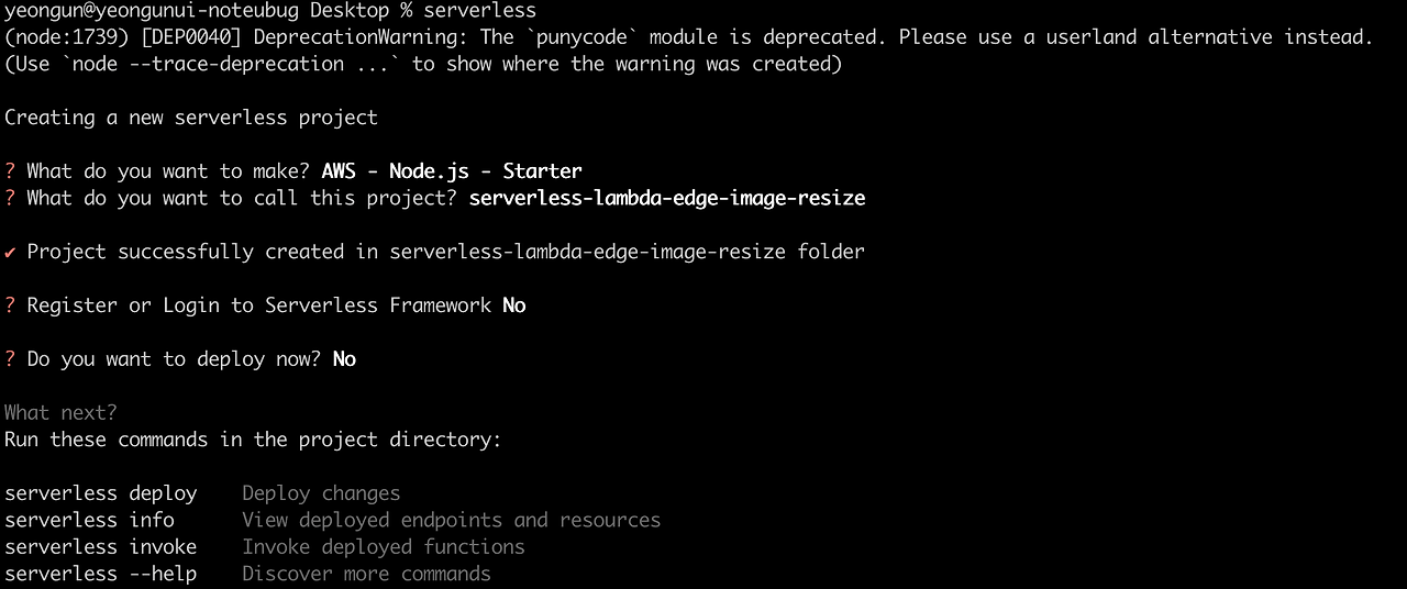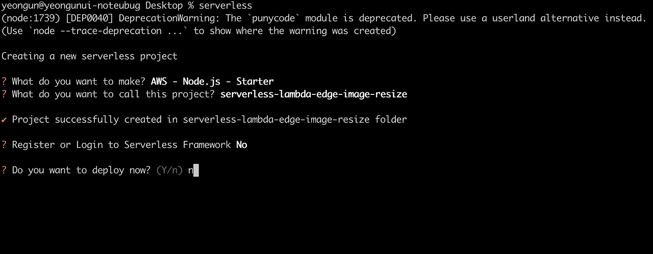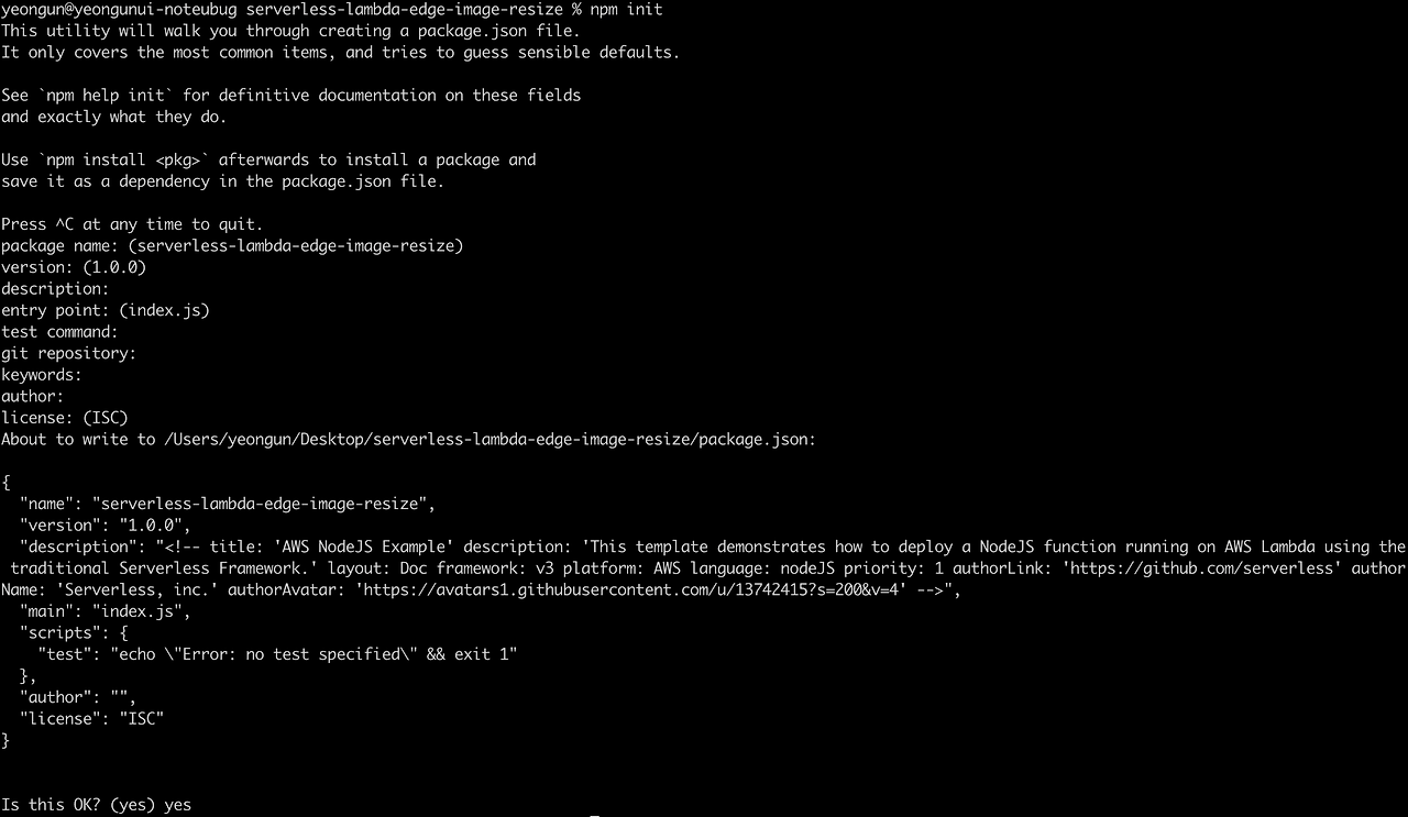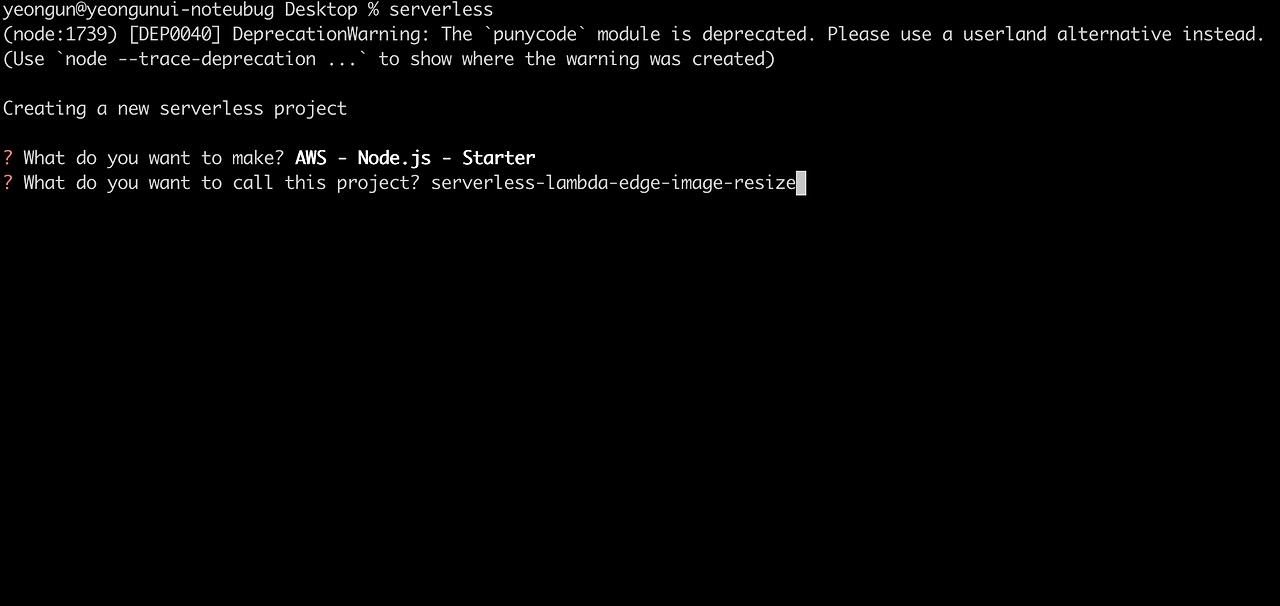 프로젝트 폴더 명을 적어줍니다. 전 serverless-lambda-edge-image-resize로 폴더명을 넣었습니다.