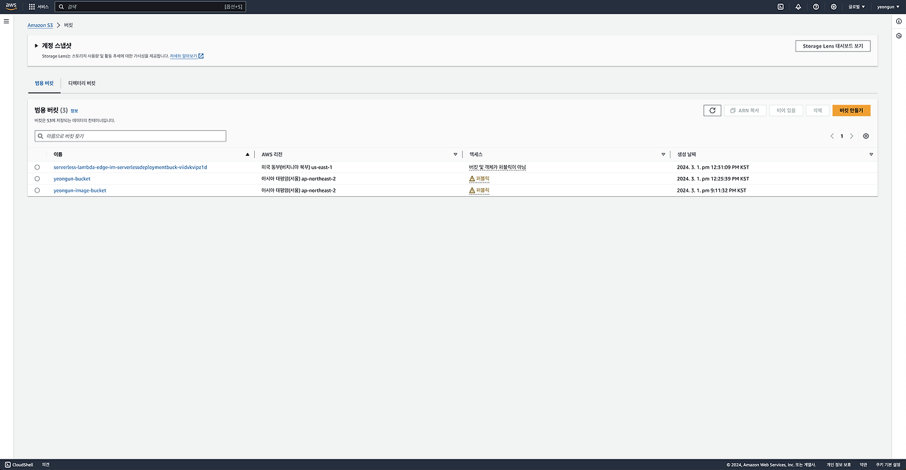 3) 생성한 버킷의 액세스가 퍼블릭으로 설정된 것을 확인할 수 있습니다.