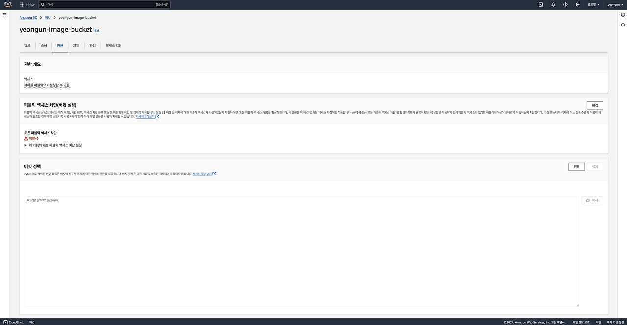 2) 생성한 버킷의 권한을 퍼블릭으로 설정합니다.