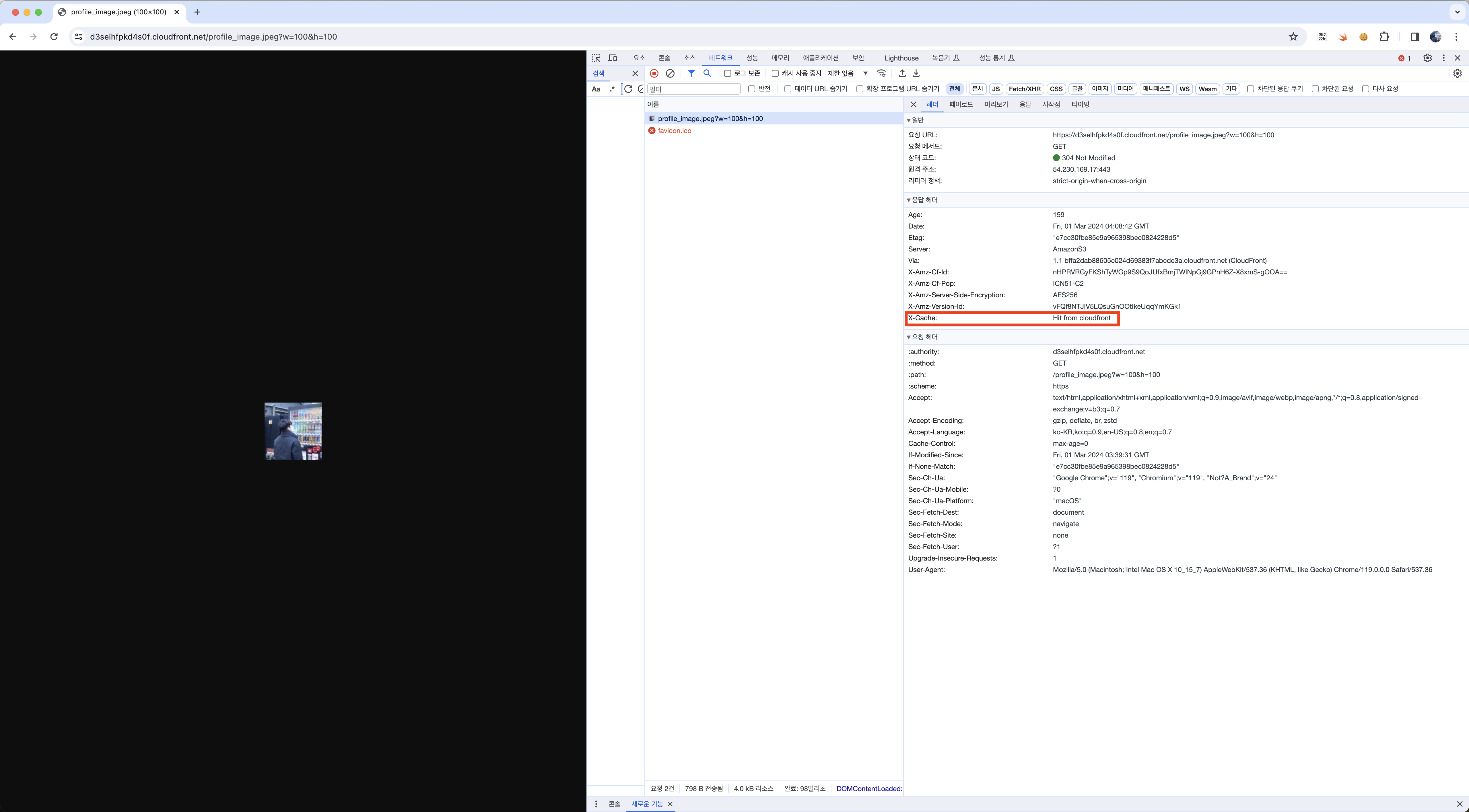 그 다음 url 끝에 ?w=100&h=100과 같이 리사이징하려는 width, height를 입력하면 리사이징이 제대로 적용된 것을 확인할 수 있습니다. 개발자도구를 통해 아직 CloudFront에 캐싱되지 않아 원본 S3 버킷에서 이미지를 가져왔고, 람다 연산이 동작한 것을 볼 수 있습니다.