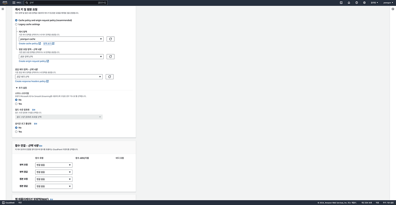 4) CloudFront 생성 화면으로 다시 돌아와 방금 생성한 캐싱 정책을 선택합니다.