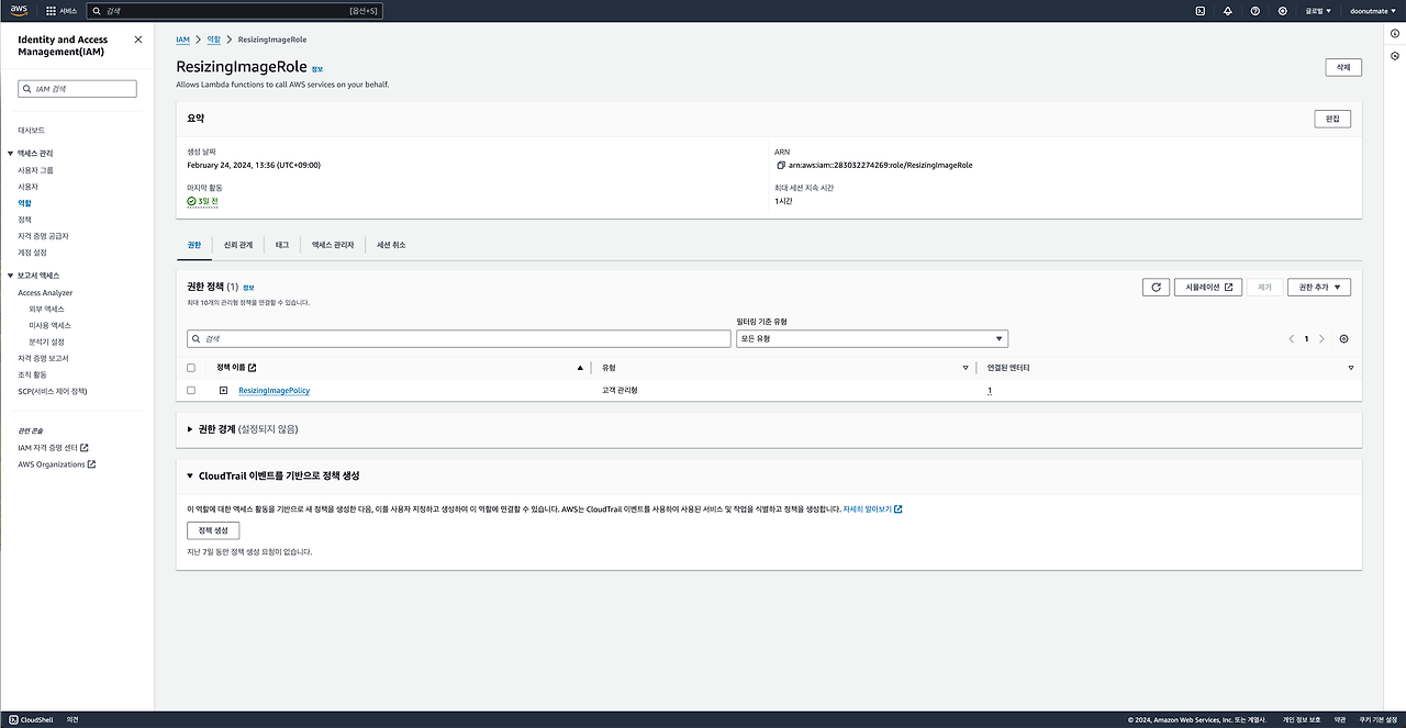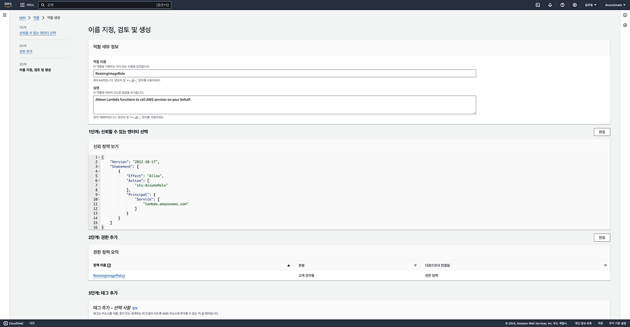 7) 역할 이름은 ResizingImageRole로 정한뒤, 설정한 권한이 제대로 추가되었는지 한번 더 확인합니다.