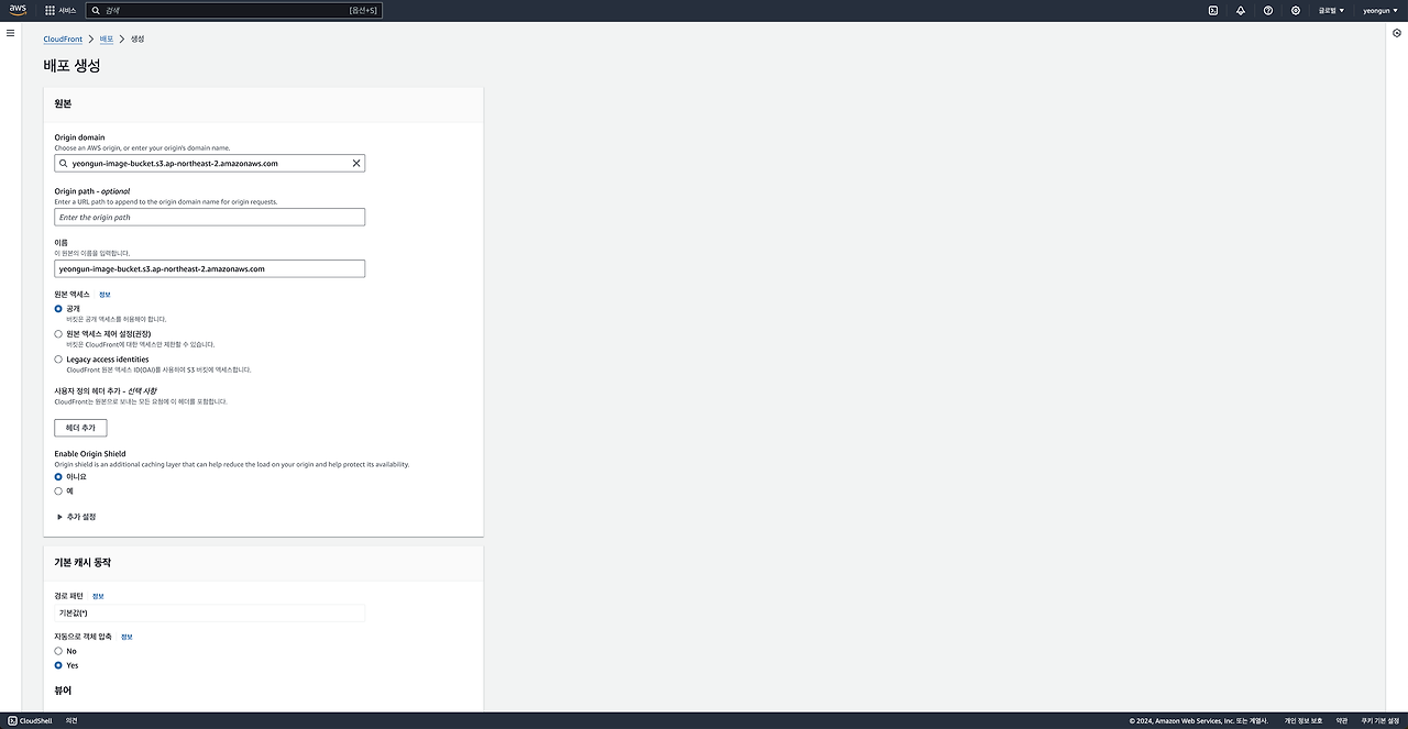 1) S3 버킷을 생성했다면 그 다음으로 CloudFront를 생성합니다. 이때 Origin domain에는 방금 생성한 S3를 연결합니다.