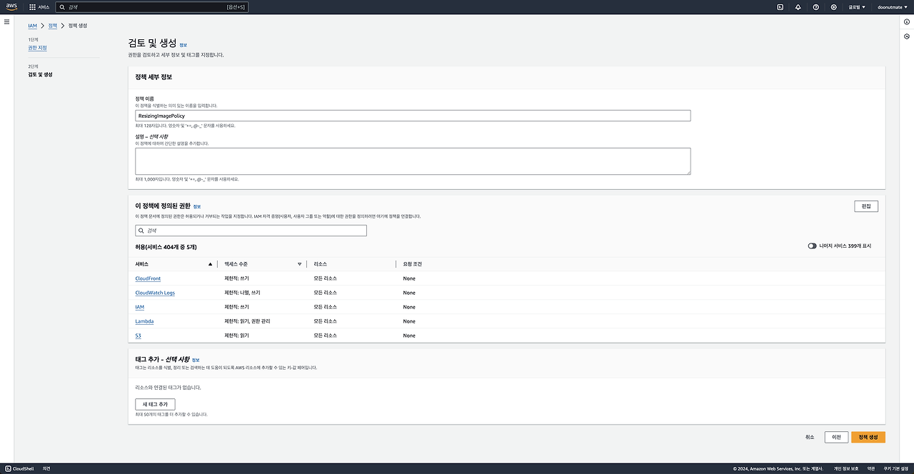 3) 정책 이름은 ResizingImagePolicy으로 정한 뒤, 정책에 정의된 권한 목록을 한번 더 확인합니다.