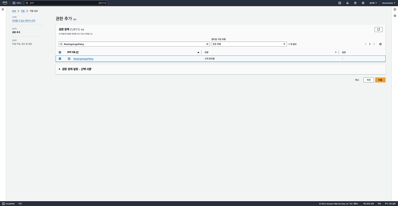 6) 권한 추가에서는 방금 생성한 ResizingImagePolicy을 선택합니다.