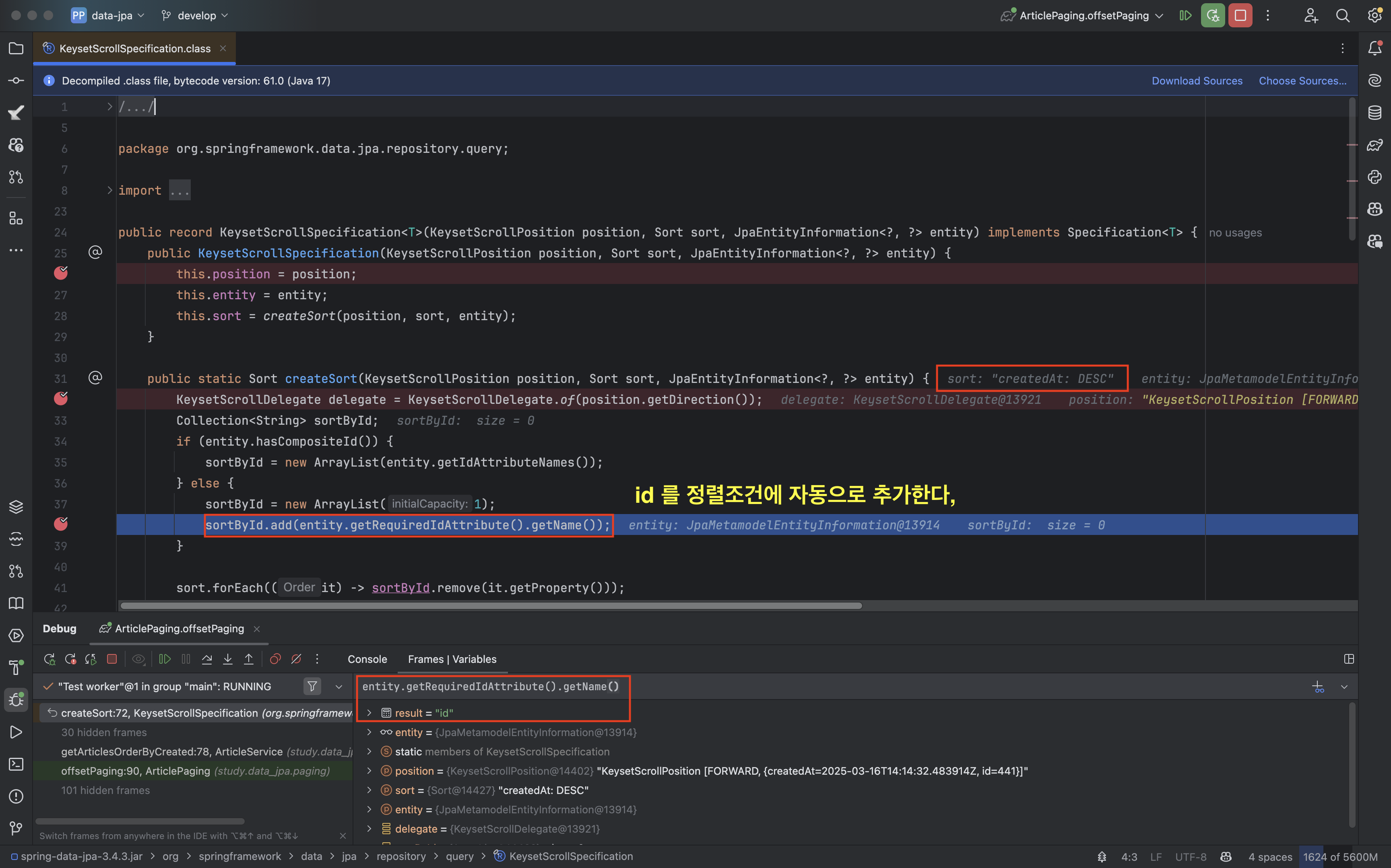 Spring Data JPA는 keyset-filtering을 사용할 때 KeysetScrollSpecification.creatSort() 메서드를 통해 정렬 조건을 만든 뒤 이를 쿼리에 사용합니다. 이때 sortById.add(entity.getRequiredIdAttribute().getName()); 구문에서 id를 정렬조건으로 자동으로 추가한다는 사실을 디버깅을 통해 알 수 있었습니다.