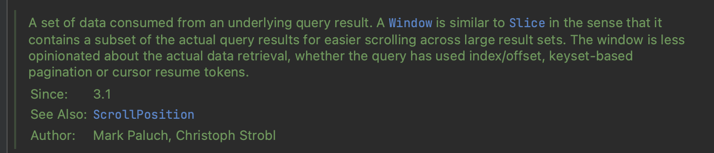 위의 See Also: ScrollPosition 에서도 알 수 있듯이, Scroll API는 ScrollPositon과 함께 사용합니다. ScrollPositon 인터페이스의 구현체에는 OffsetScrollPosition과 KeysetScrollPosition이 있습니다.