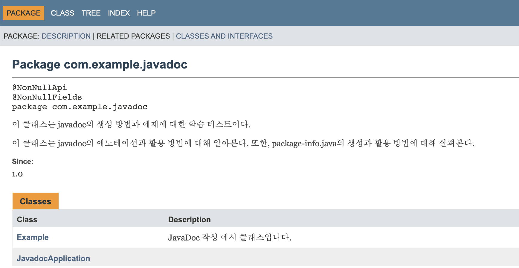 위의 package-info.java를 패키지 내 생성하면 아래와 같은 Javadoc이 생성됩니다.