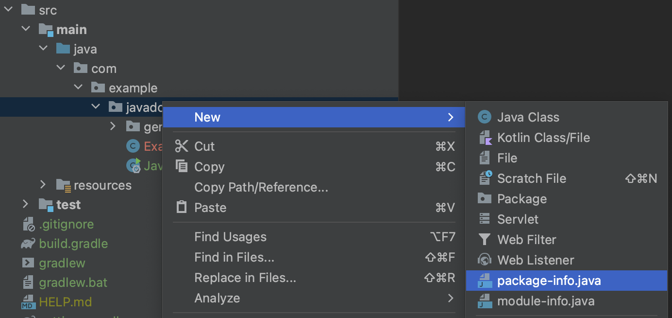 인텔리제이에서 패키지를 오른쪽 클릭한 뒤 New > package-info.java를 클릭해 파일을 생성할 수 있습니다.